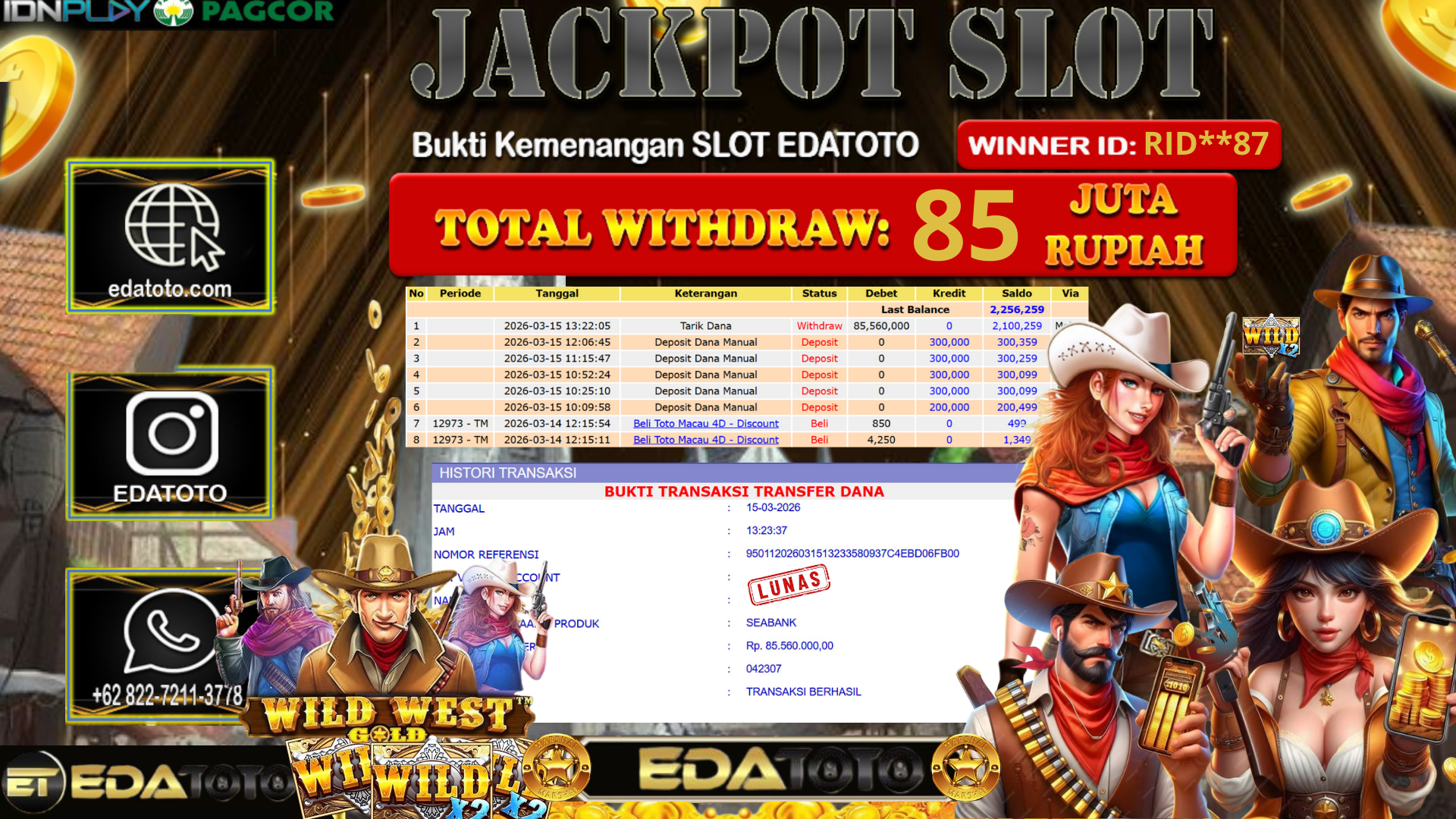 Selamat Kepada Pemilik user ID : RID**87 Hari/Tanggal : Minggu / 15 MARET 2026 Jackpot : Rp, 61,303,210 JT Withdraw . . .