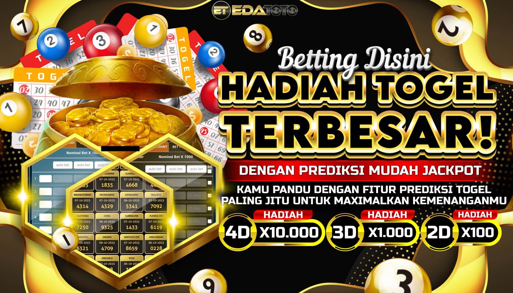 Prediksi EdaToto tidak disangsikan kembali masalah memberi rumus prediksi togel resmi dan terpercaya. Sekarang ini banyak beberapa bettor togel online yang nikmati permainan pasaran togel cambodia di sini. Karena kami keluarkan rumus prediksi togel online, yang bisa menolong beberapa bettor untuk menerka angka keluaran togel cambodia secara cepat dan mudah. Untuk Anda yang ingin segera bermain togel cambodia dapat segera bergabung dan nikmati tiap taruhan pasaran togel dengan EdaToto hari ini.